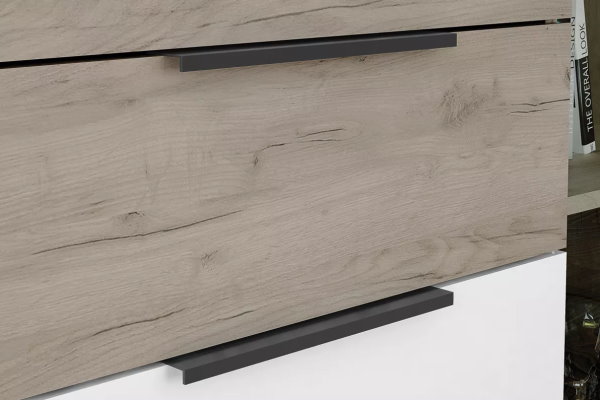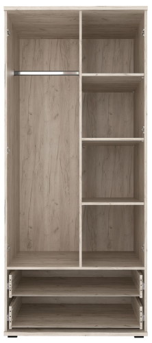 Шкаф 2-х дверный Альянс с ящиками - входит в модульную гостиную Альянс. Корпус изготавливется из высококачественного ЛДСП в цвете Дуб крафт. Фасады дверей из ДСП которое выкрашивается в четыре слоя высокоглянцевой краски в автоматизированной покрасочной камере. Фасады ящиков производятся из того же материала что и корпус. Петли на дверях четырехшарнирные с системой плавного закрывания. Направляющие ящиков шариковые полновыкатные. Ручки из черного прочного пластика. Ножки также из черного пластика. Наполнение шкафа - слева полноразмерная штанга, справа три полки, внизу два ящика.